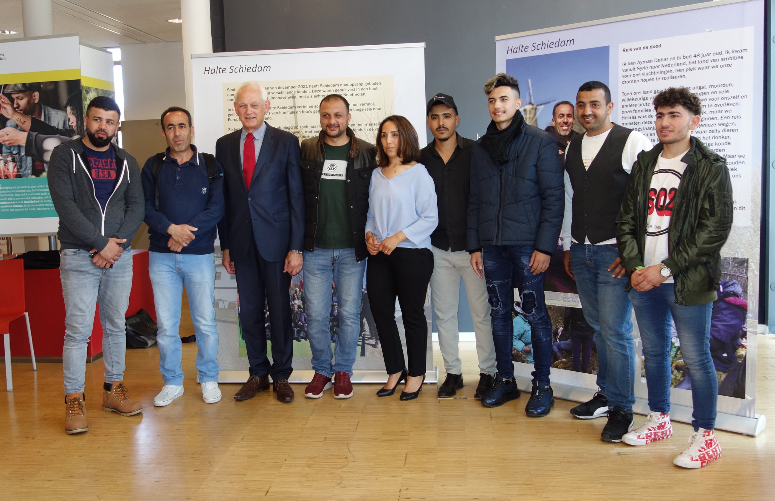 Vanaf eind december 2021 tot 20 april 2022 heeft Schiedam noodopvang geboden aan 50 asielzoekers uit Jemen, Afghanistan, Nigeria, Eritrea en Syrië. Zij werden gehuisvest op een boot die aangemeerd lag aan de Buitenhavenweg. Inmiddels zijn ze verplicht verhuisd naar verschillende opvangcentra in het land. In de tentoonstelling 'Halte Schiedam' vertellen zij waar ze vandaan komen, de weg die ze hebben afgelegd en wat ze zoeken in Nederland. De tentoonstelling van ‘Halte Schiedam’ werd op 12 mei door de Schiedamse burgemeester Cor Lamers geopend in het Klant Contact Centrum (KCC) in het stadskantoor Schiedam. De volgende ‘Halte Schiedam’ is vanaf zaterdag 9 juli, 15.00 uur, de Grote of Sint Janskerk.