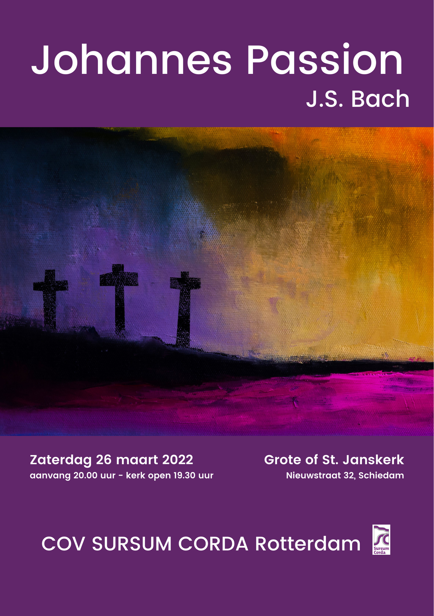 De afbeelding op het affiche laat links de rauwe duisternis van de Godverlatenheid op Golgotha zien, maar wij mogen weten dat het daar niet bij blijft. Na drie dagen is er het licht van Pasen wat aan de rechterkant van de afbeelding verbeeld wordt. En zoals in het laatste koraal in de Johannes Passion zo prachtig wordt vertolkt is er, voorbij Pasen en zelfs over de dood heen, uitzicht op het eeuwige leven.