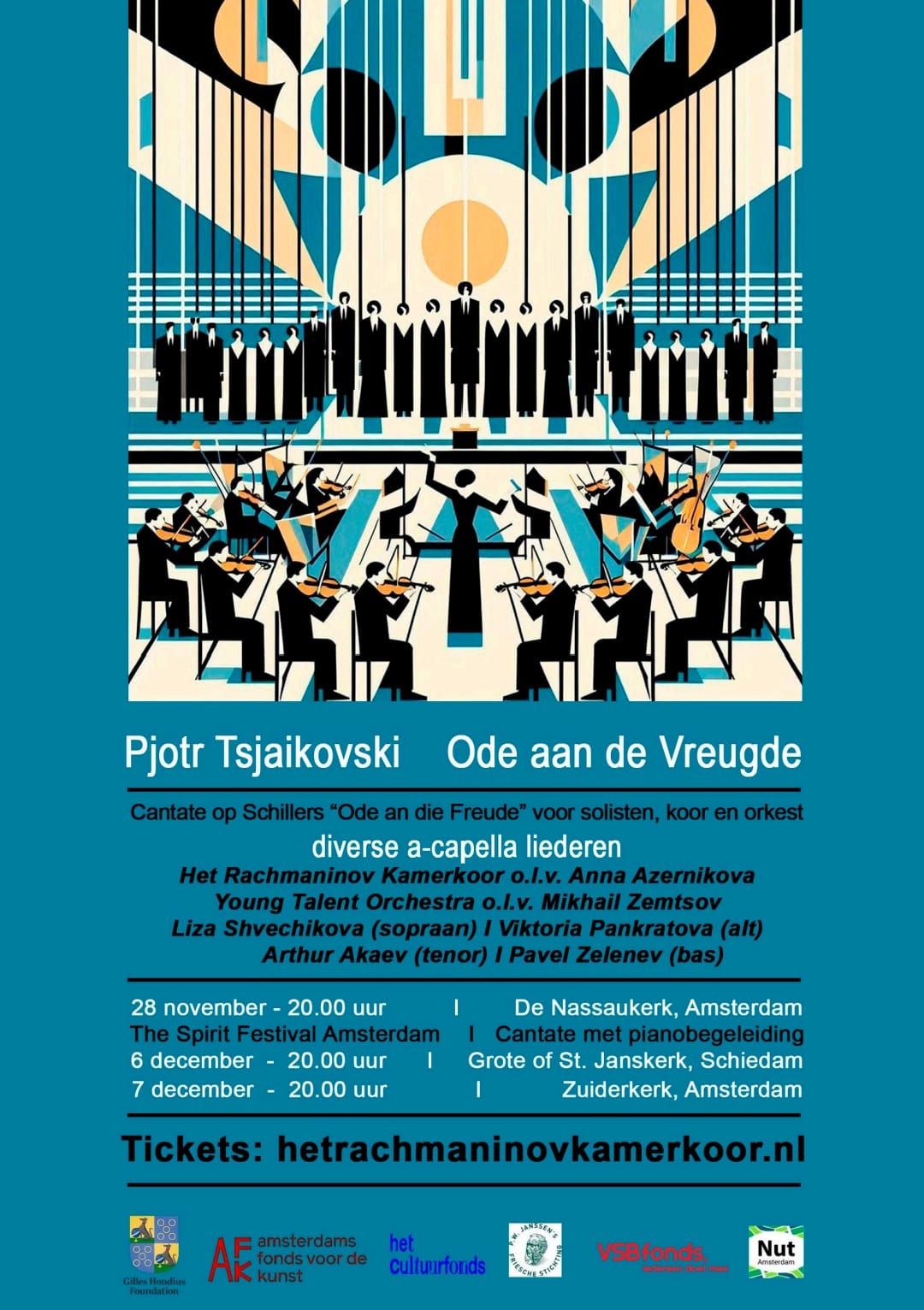 FEEST! Op zaterdag 6 december a.s. viert het Rachmaninov Kamerkoor o.l.v. Anna Azernikova zijn 20-jarig jubileum met een selectie a capella liederen van Archangelski, Gretsjaninov, Rimsky-Korsakov en Rachmaninov. Vervolgens de uitvoering van de Jubelcantate van P.I. Tsjaikovski “Ode aan de vreugde”, met vier solisten en het Young Talent Orchestra o.l.v. Mikhail Zemtsov. Het YTO komt uit de regio Rotterdam/Schiedam en is bekend van eerdere concerten in de Grote of Sint Janskerk.
